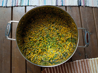 Ohjeen mukaan piertaryrtin kukinnot piti jättää liemeen koko värjäyksen ajaksi. Keitos näytti kuitenkin niin sotkuiselta, että päädyin siivilöimään sen mustaan pesupussiin, jolloin suurin osa roskista ei päässyt lankojen joukkoon. Vettä kattilassa oli niukanlaisesti, mutta juuri ja juuri riittävästi.