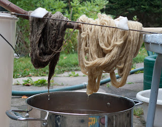 Raparperikeittoon lisäsin 10 g alunaa, sillä epäilin värin tarttuvuutta huopalankaan. Lankaan tuli lopulta hyvin kevyt vihreä sävy. Ilmeisesti huopalanka on käsitelty jollain kemikaalilla, sillä siihen tuntuu tarttuvat väriä erityisen huonosti. Molemmat raparperilla värjätyt langat ovat nimittäin 100 % villaa. Vaikka se ei ehkä kuvassa kovin selvästi näy, niin tummempi lanka on luonnonvalossa selvästi vihreän sävyinen. Raparperiliemeen lisäsin viimeisen vartin ajaksi 5 g rautavihtriiliä (jonka löytäminen oli myös aika kokemus..).