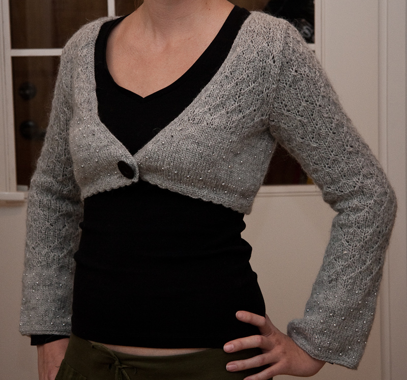 Sain vihdoin valmiiksi jo aikaisin kesällä aloittamani boleron. Into ehti lopahtaa monta kertaa, mutta kyllähän se lopulta valmistui. Boleron hihoissa ja helmassa on pieniä hopeahelmiä lankaan pujotettuina ja muut osat ovat pitsineuletta. Reunat on huoliteltu virkkaamalla.