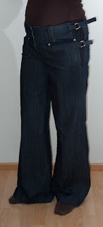 Pohdin pitkään, mitkä housuni raaskisin uhrata, mutta päädyin lopulta näihin, koska ne olivat jo hankintahetkellä liian pienet.. Ne ovat siis Vilan joustavat ja korkeavyötäröiset farkut kesältä 2009. Purin farkkujen sivusaumat auki ja ompelin niihin jumppatrikoosta  kiilat. Koska housuissa on nyt reilusti kasvunvaraa, tein kiiloihin säädettävät lenksut. Kangasvarastoista löytyi myös täydellisen sopivanväristä farkkukangasta säätöremmeihin. Vain D-rinkulat piti hakea kangaskaupasta.