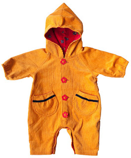 Tämä iloisen oranssi kevyt kevät-kesähaalari valmistui jatkona siniselle fleecetakille. Kaavatkin ovat osittain samat. Päällyskankaana haalarissa on siis oranssi vakosametti ja vuorikankaana punainen melko paksu ja jämäkkä trikoo. Molempia kankaita jäi jonkin verran yli. En tiedä miten nuo Ottobren ohjeiden kangasmitoitukset on tehty, mutta ainakin minulle melkein puolet vähemmän kangasta olisi riittänyt. Toisaalta, nyt ainakin tuosta punaisesta ökkömönkiäiskankaasta saa vielä ommeltua pikkuisen bodynkin.