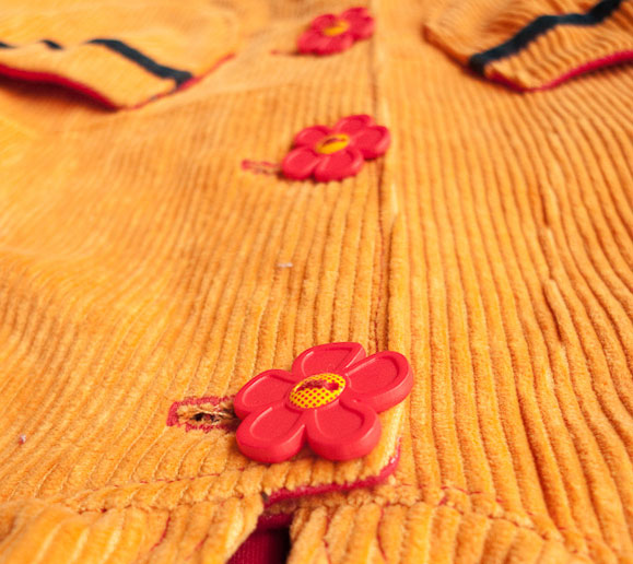 Tämä iloisen oranssi kevyt kevät-kesähaalari valmistui jatkona siniselle fleecetakille. Kaavatkin ovat osittain samat. Päällyskankaana haalarissa on siis oranssi vakosametti ja vuorikankaana punainen melko paksu ja jämäkkä trikoo. Molempia kankaita jäi jonkin verran yli. En tiedä miten nuo Ottobren ohjeiden kangasmitoitukset on tehty, mutta ainakin minulle melkein puolet vähemmän kangasta olisi riittänyt. Toisaalta, nyt ainakin tuosta punaisesta ökkömönkiäiskankaasta saa vielä ommeltua pikkuisen bodynkin.