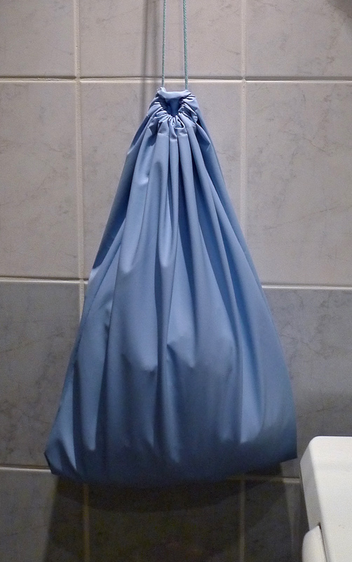 Pussi on tehty PUL-kosteussulkukankaasta. Yläreunaan ompelin nauhakujan, jonne pujotin vaaleansinistä puuvillanyöriä. Pussi roikkuu kylppärin seinässä olevasta pyyhetelineestä. Pusseja on nyt kaksi samanlaista. Tarkoitus olisi, että pussi kerätään täyteen, tyhjennetään pesukoneeseen ja heitetään sinne sitten mukaan. Kun toinen pussi on pesussa, niin toinen on puhtaana odottamassa. Materiaaleja on vielä kolmanteen, reissupussiin. Sitä voisi sitten kantaa matkassa mukana ja kerätä sinne käytetyt vaipat kotiinkuljetettavaksi.