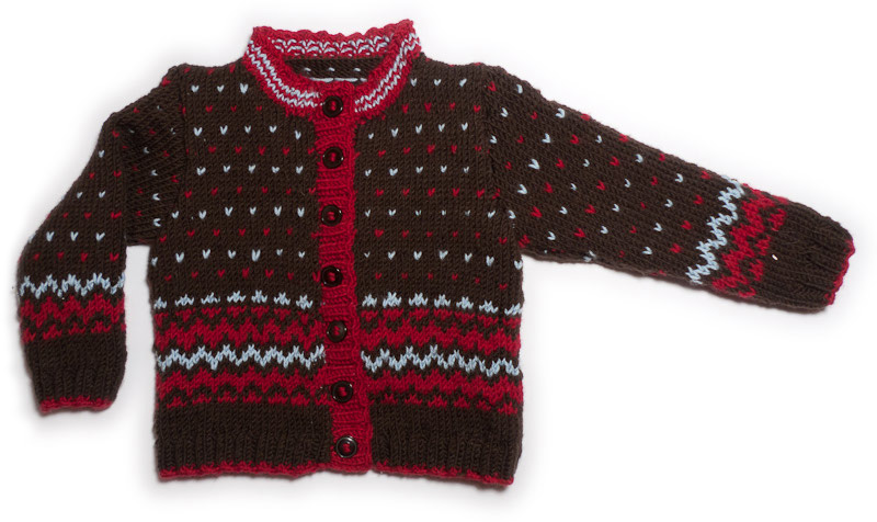 Lankana villatakissa on Debbie Bliss baby cashmerino, jota minulta löytyi 3 ruskeaa kerää, 2 punaista ja yksi vaaleansininen. Lähdin iloisesti neulomaan kaunista kirjoneuletakkia sen tarkemmin ohjetta lukematta. Yllättäen olin valinnut aloitusvärin väärin ja huomasin virheen vasta kirjoneuleraidan alussa. En jaksanut purkaa jo neulomaani alkua, joten malli piti soveltaa sopivaksi.. Eihän tämä muistuta nyt alkuperäistä mallia ainakaan kuvioiltaan juuri lainkaan, mutta oikein sievä siitä tuli!