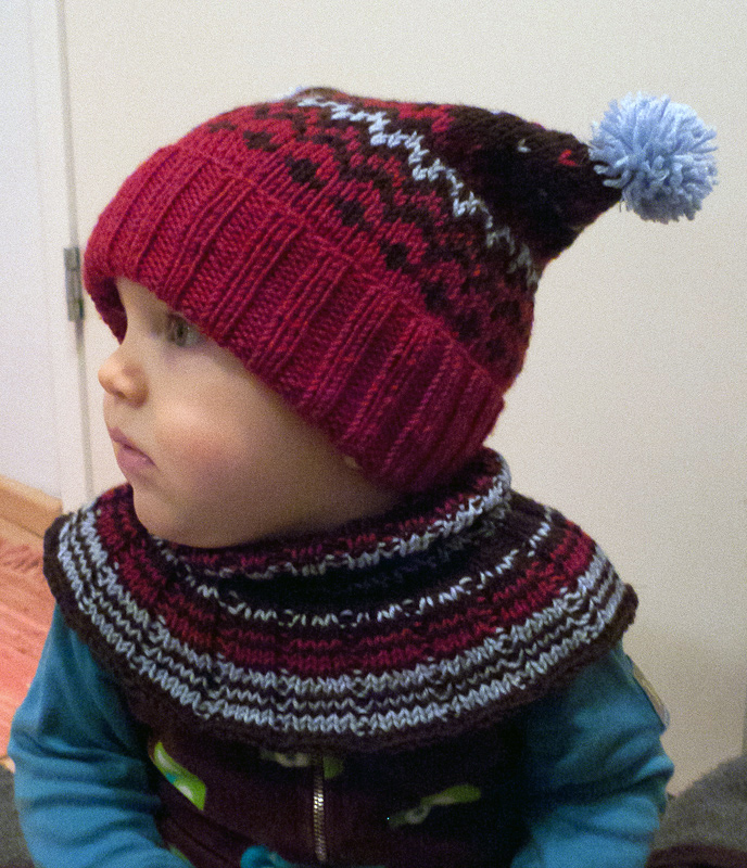 Kauluri onnistui kyllä yli odotusten. Se näyttää juuri oikean kokoiselta! Pipokin on passelin kokoinen. Lankaa jäi vielä jonkin verran, tosin ruskea alkaa olla aika finaalissa, joten mahdollisista lapasista tulee puna- tai sinivoittoiset.