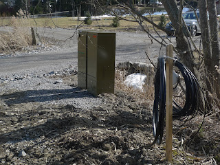 Naapuriin olikin nyt noussut uusi omakotitalo. Se ei lainkaan helpottanut mun hirmuisena vellovaa omakotitalokuumetta. Hehän ostivat tontin meidän jälkeemme! Epäreilua! Jotain omakotitaloon viittaavaa tontilta sentään löytyi, nimittäin sähkökaappi ja johtorulla. Jee ja vau! Alla siis uusi näkymä tontin eteläreunalta pohjoiseen.