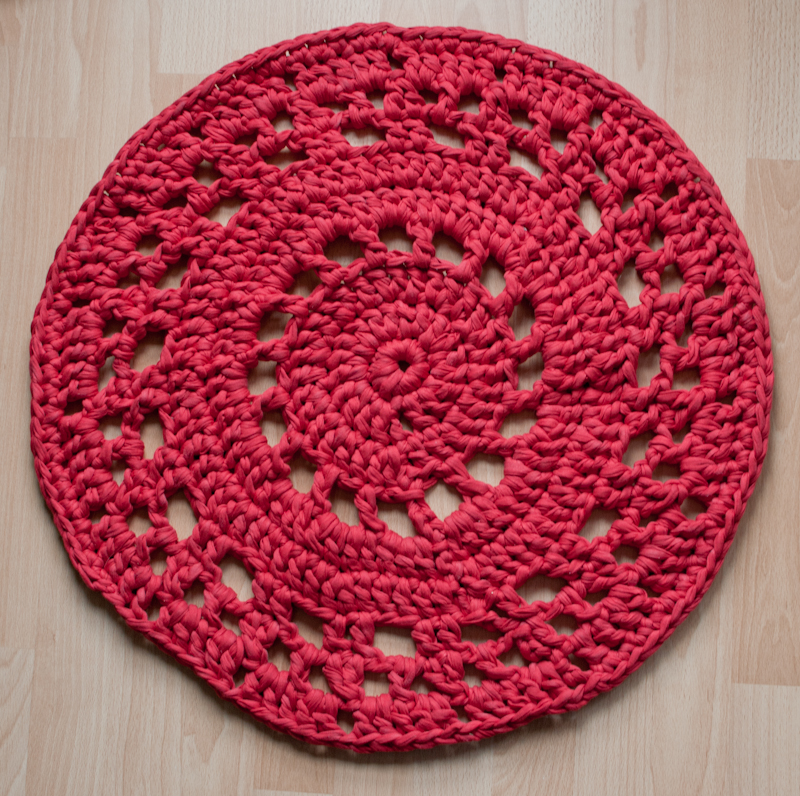 Nyt kude on saanut uuden muodon. Saa nähdä, miten kauan tämä minua miellyttää. Kude loppui vähän kesken, kuvan alareunassa maton ulkoreunan kierros jäi vajaaksi. Lattialla tuota ei juuri huomaa. Saattaa kuitenkin olla, että se alkaa häiritä minua, ja joudun virkkaamaan tämän murheenkryynin vielä kertaalleen.