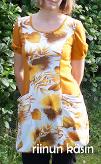 Tämän ihanuuden kankaat löytyivät äidin kangaskaappien uumenista. Oikestaan minun piti tehdä vain testitunika ilman taskuja, mutta sitten päätin, että kai siitä voi kokonaisen käyttövaatteenkin tehdä..