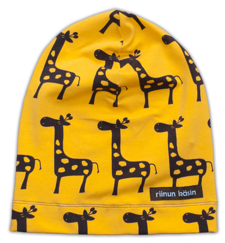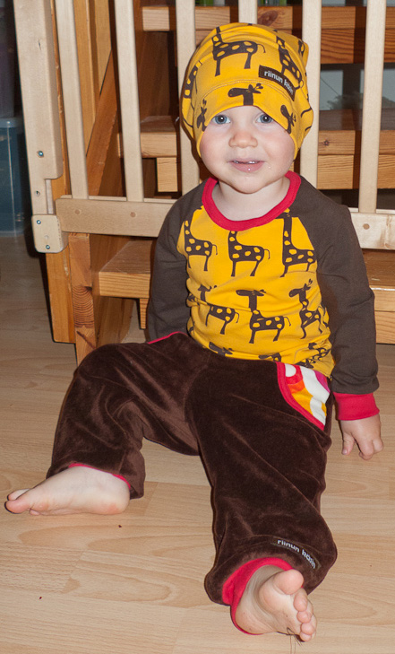 Kirahvikankaan jämistä syntyi vielä Vilholle paita ja pipo – ja hyvätpä syntyivätkin! Ensikokeilussa tämänaamuisessa muskarissa vaatteet keräsivät katseita ja vähän kehujakin. Kysyttiinpä jopa, myynkö näitä jossain.