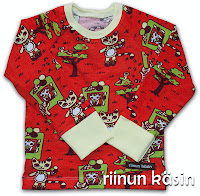 Samaan syssyyn valmistui myös kaksi paitaa pojalle. Meinasin ensin kohdistaa kissapaidan kuviot, mutta koska olin onnistunut leikkaamaan etu tai takakappaleen ihan hullusta kohdasta, olisi tähän yhteen paitaan tuhraantunut melkein koko kangas. Laitoin nuo nyt niin, ettei kohdistamattomuus satu ainakaan omaan silmään. Leijonat sentään tajusin asettaa jotenkin järkevämmin.