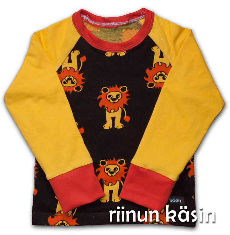 Samaan syssyyn valmistui myös kaksi paitaa pojalle. Meinasin ensin kohdistaa kissapaidan kuviot, mutta koska olin onnistunut leikkaamaan etu tai takakappaleen ihan hullusta kohdasta, olisi tähän yhteen paitaan tuhraantunut melkein koko kangas. Laitoin nuo nyt niin, ettei kohdistamattomuus satu ainakaan omaan silmään. Leijonat sentään tajusin asettaa jotenkin järkevämmin.