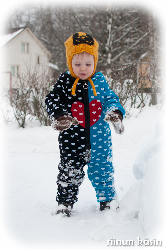 Huppuun muistin jopa laittaa kangasmerkin ja sen alle pätkän heijastinnauhaa. Kaavat ovat Ottobresta (4/2012). Vetoketjun siirsin keskelle eteen, sivuista kavensin. Haalari on kokoa 104, ja yllättäen siinä ei ole yhtään ylimääräistä, vaikka olettaisin Vilhon olevan vasta vähän yli 90-senttinen!