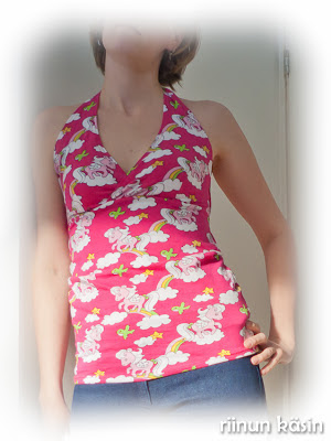 Umpimähkään leikellyistä paloista syntyi ”vähäks-ihku” kesätoppi. Kangasta ei ollut riittävästi kuin halterneck-versioon, joten tein sellaisen. Kiitokset kankaasta Ompeluelämä-kaverille ja anteeksi rintsikanolkaimista toisessa kuvassa. Mun vaatteet on Vilhon huoneessa ja Vilho oli nukkumassa. Piti siis tyytyä niihin vaatteisiin, joita muista huoneista ja päältä löytyi 🙂