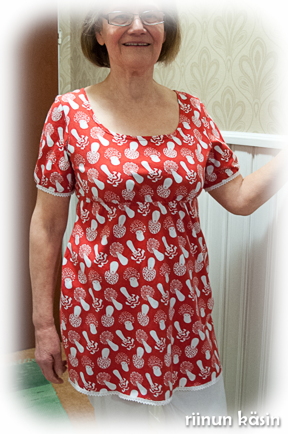 Halusin tehdä mummille, joka toimii meidän perhepäivähoitajana, lahjatunikan. Kaavat ovat Ottobresta, mutta en kyllä enää muista, mikä malli on, sillä tämä on ollut keskentekoisena sen verran pitkään.