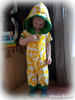 Taikametsähupparistani syntyi kesähaalari Vilholle 🙂 Laitoin tuon hupparin päälleni kai kaksi kertaa, enkä tykännyt siitä. Purin siis vaatteen ja ompelin siitä tällaisen. Pohjana on Ottobren jumpsuitin kaava, hupun pienensin ihan vapaalla kädellä. Haalaria ei ole viimeistelty täydellisesti, mutta tämä kelpaa ihan varmasti pihaleikkeihin 🙂 Tarkoitus oli tehdä tästä ihan lyhytlahkeinen, mutta selkäosa oli aivan liian pitkä, joten pidensin sitten lahkeita.. Jospa tälle tulisi nyt käyttöä 🙂