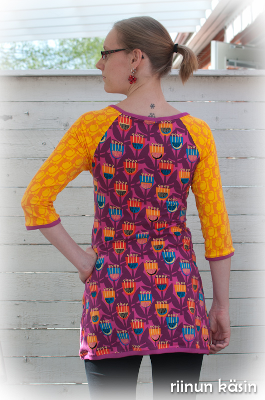 Pohjana on raglanpaidankaava, jonka etukappaleen olen muuttanut. Yläosa on siis kietaisumallinen. Tälle kankaalle malli oli kuitenkin vähän huono, sillä kangas on vähän turhan tukevaa. Paita on KUUMA. Ehkä se talvella menee paremmin. Tämä on siis myös potentiaalinen imetyspaita 😉 Takaa tämä on niin kiva, että mielessäni kävi muutamaan kertaan tuosta etuosasta luopuminen.. Tulppaanikangasta on vielä sen verran, että voin muuttaa tämän, jos malli on käytössä ahdistava.
