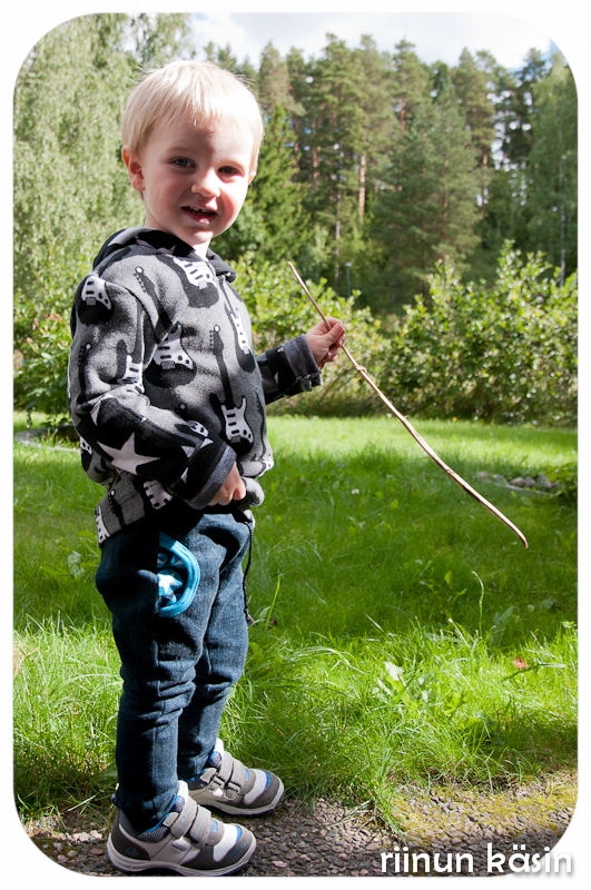 Vähän tuo malli on hupsu farkuiksi, mutta Vilho on aivan ihastunut näihin! Ilmeisesti ne on ainakin tosi mukavat päällä, mikä tietysti onkin pääasia. Tällä voisi kyllä toisetkin housut, vaikka collegesta/joustocollegesta, mutta yläosaa pitäisi kaventaa jonkin verran, sillä näissä on varmaan jotain vaippavaraa (jota meillä ei ole pian puoleen vuoteen tarvittu 🙂 ) tai muuten vaan älyttömästi löysää yläosassa ja vyötäröllä. Toisaalta lahkeet ovat minusta vähän liian tiukat pojan housuiksi, vaikka jätin niihin ylimääräistä väljyyttä. Vyötäröllä on kuminauha ja kiristysnaru. Ihan kivat melkein-pillit farkut näistä kuitenkin tuli. Pyynnöstä Vilho poseerasi jopa niin, että etutaskukin näkyi kunnolla 😉 Hyvin olen jälkikasvuni tällä saralla kouluttanut 🙂