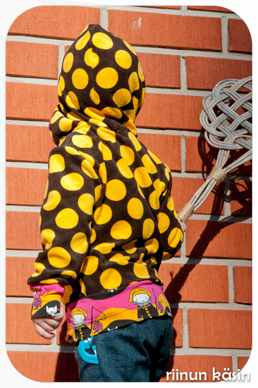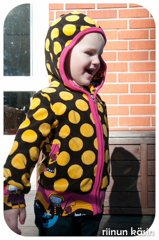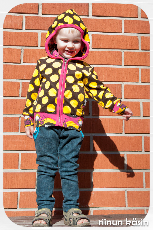 En mä varmaan koskaan saa sitä omaa pikkutyttöäni, joten pitää välillä hempeillä tämän riiviön kanssa 🙂 Malli on sama kuin hippihupparissa (OB 4/2013). Pallofrotee on Metsolalta ja kalastajatrikoo Majapuulta. Tää on aika ihku, vaikka nuo hupun pallot eivät kohdistukaan. Mikä lie laiska leikkaaja oli taas hommissa 😉