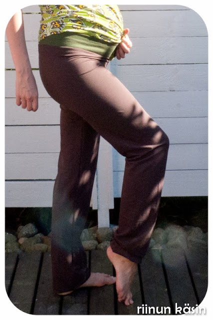 Itselleni tein Kestovaippakaupan joustocollegesta kotilököhousut. Lähinnä ajattelen tuota äitiysloma-aikaa, jolloin varmasti kaipaan paljon ihania, pehmeitä ja mukavia kotivaatteita. Kuten kuvasta näkyy, pikkuvaatteiden käyttäjä venyttelee vielä jonkin aikaa äidin masua. Lököpöksyissä on resorit lahkeissakin, jotta lahkeet eivät laahaisi maata. Myös resori on Kestovaippakaupasta.
