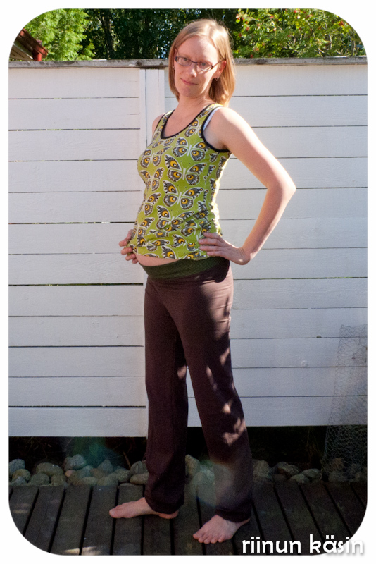 Itselleni tein Kestovaippakaupan joustocollegesta kotilököhousut. Lähinnä ajattelen tuota äitiysloma-aikaa, jolloin varmasti kaipaan paljon ihania, pehmeitä ja mukavia kotivaatteita. Kuten kuvasta näkyy, pikkuvaatteiden käyttäjä venyttelee vielä jonkin aikaa äidin masua. Lököpöksyissä on resorit lahkeissakin, jotta lahkeet eivät laahaisi maata. Myös resori on Kestovaippakaupasta.
