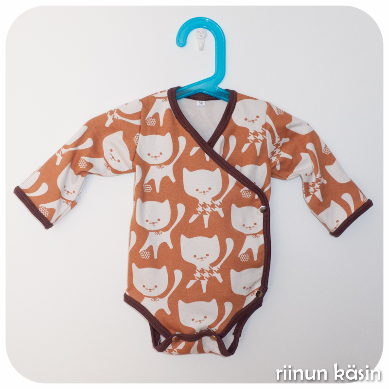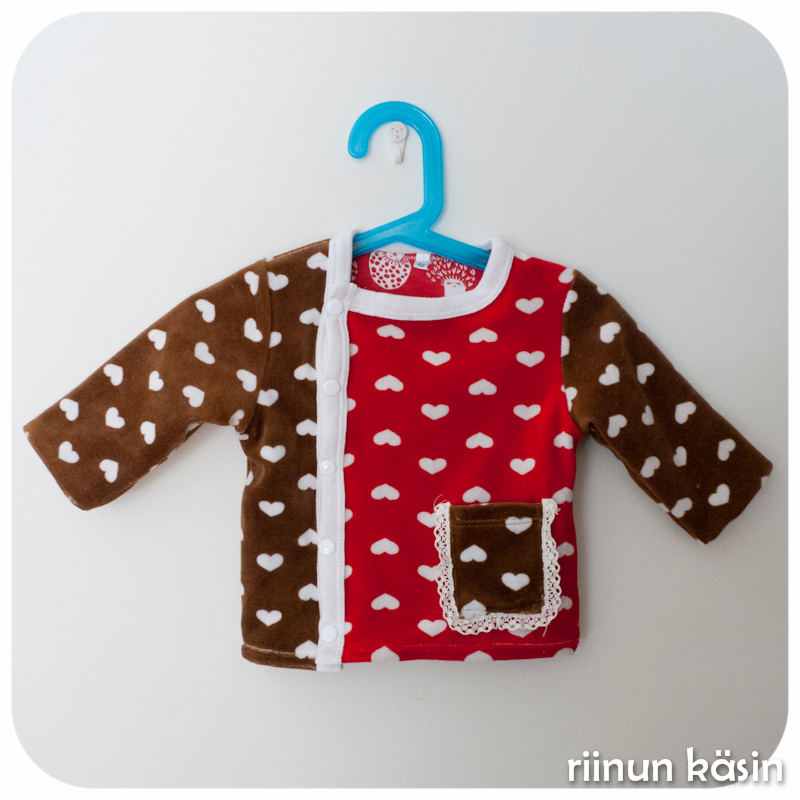 Tänään valmistui muutama ruskeasävyinen vaate. Noshin interlocktrikoosta syntyi ihana kisubody kietaisumalliin. Ikasyrin sydämet pääsivät jo toiselle kierrokselle, kun vanhasta (huonosta) paidasta syntyi pieni takki. Vuorina velourtakissa on PaaPiin sienitrikoota.