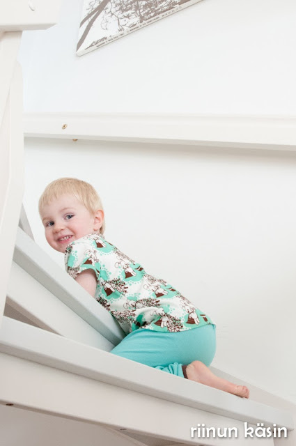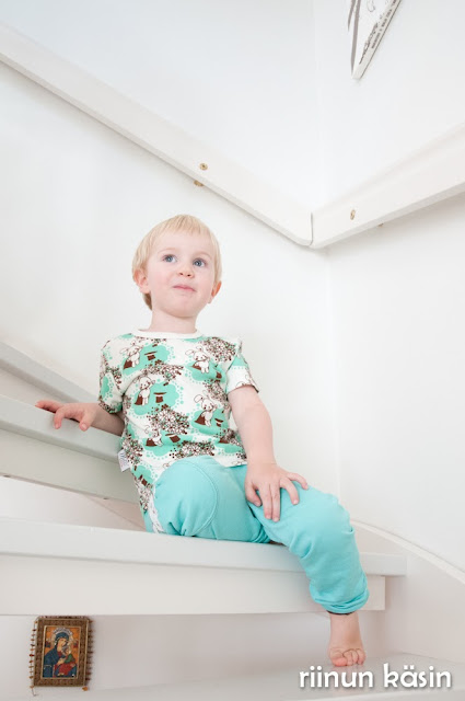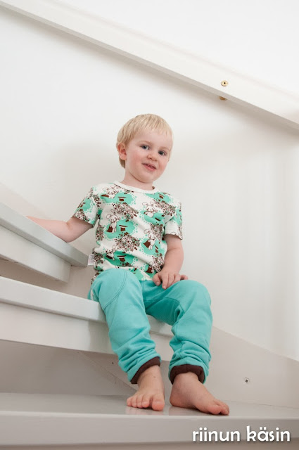 Melli EcoDesignin ihanaakin ihanampi t-paita sai kaverikseen pupucollarit. Collegekangas on äidin kangaskaapista ja suklaanvärinen resori jämä jostain. Kaavana toimi jonkin verran muokattu pyjamakaavasta, jonka alkuperää en ollut merkinnyt minnekään. Lisäsin perushousuihin taskun, josta kurkkaa pupu. Pupufani oli luonnollisesti täysin myyty tätä settiin.