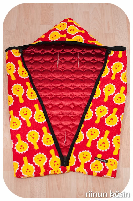 Voiko kauniita vaatteita, tarvikkeita ja asioita noin ylipäänsä olla liikaa? Minusta ei. Niinpä vauva sai vielä toisenkin toppapussin, tällä kertaa perinteisemmän mallin. Mitat ja ohjeet katsoin soveltaen Annen blogista. Kankaana on Metsolan Helistin-tikkikangas, resori on Majapuulta ja vetoketju ja stopparit Jätti-Rätistä. Tikkikankaan saumat siistin ompelemalla saumojen päälle hupussa ja helmassa mustat kanttinauhat.