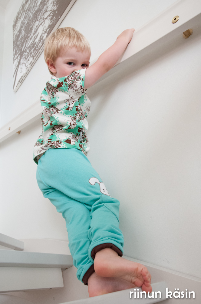 Jos isoveljen setti oli minttujätskiä, tämän täytyy olla porkkanakakkua! Nyt siis sain viimein ommeltua kasaan pikkusisaruksen Melli EcoDesign -bodylle sopivat housut. College on laatikoiden kätköistä, paksua ja pehmeää, oranssi resori Majapuulta. Kaavoina housuissa oli taas Ottobren Tiikeri (1/2013), mutta näihin vaihdoin yläosaan kuminauhan tilalle leveähkön resorin. (Koitin vähän poistaa ylimääräistä kohinaa kuvasta, mutta tasaisenruskea college näyttää yhä vähän kirjavalta.)