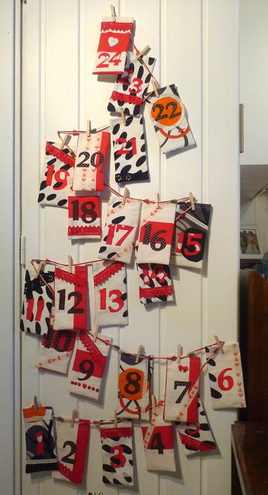 Haaveilin jo viime jouluna oikeasta joulukalenterista, mutta sain toteutettua vain tonttutalon. Nyt ryhdyin puuhaan hyvissä ajoin ja sain kuin sainkin kalenteripussukat valmiiksi ennen joulukuuta! Lähdin liikkeelle siitä ajatuksesta, että kalenterista ei tule säkkikankaista, vaan jotain vähän modernimpaa. Itse olen tähän muuttorumban keskellä silloin tällöin pala kerrallaan tehtyyn kalenteriin enemmän kuin tyytyväinen! Kankaat ovat Ikean valmistilkkuja sekä omia tilkkuja, koristeet Jätti-Rätistä ja omista varastoista. Hauskan nauhan löysin paikallisesta kirjakaupasta, samoin pikkuiset pyykkipojat.