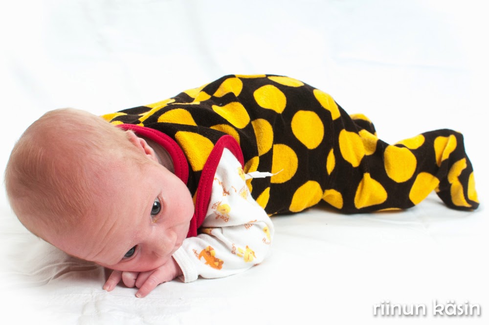 Joutessani ompelin vielä yhdet potkuhousut joustofroteesta, kun eihän niitä ole ennestään yhtään 😉 Malli on sama kuin villahousuissakin. (Juniorilla on ikää reilut 3 viikkoa 🙂 )