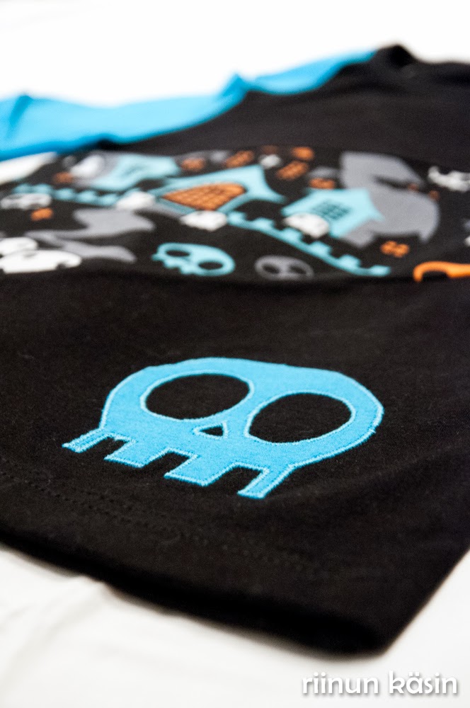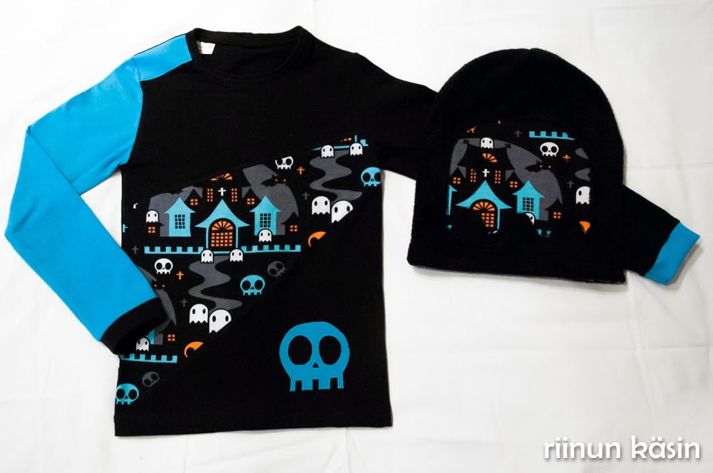 Sari Ahokaisen Boo-kangas kotiutui meille jo jonkin aikaa sitten, mutta koska yksiväriset kankaani olivat loppu, se joutui odottelemaan hetken ompeluvuoroa. Tämä setti valmistui syntymäpäivälahjaksi 7 vuotta täyttävälle kummipojalleni. En vielä saanut enempää palautetta, mutta ei nämä ainakaan suoraa tuomiota saaneet. Koon pitäisi olla oikea, sillä se on samalla kaavalla (olen onnellisesti unohtanut millä) tehty kuin sopivaksi todettu joululahjapaita.