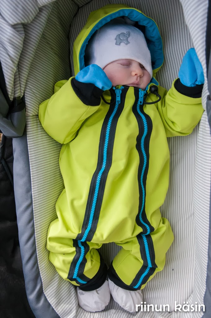 Haalari on tehty Eurokankaan softshell-kankaasta. Vetoketjut jätin päälle näkyviin, niiden takana on tuulilistat. Raglansaumoissa on heijastinteret ja hihoissa mustat resorit. Ja kylläpä mä oon nyt tyytyväinen tähän! Vain tuo hupun alavara on vähän niin ja näin. Se ei ole ihan siisti, mutta katsotaan nyt, alkaako se häiritä minua, tuskin. Hupun kiristysnauhan päät piiloutuvat sauman sisään ja hupun saa kiristettyä stoppareilla. Hupun rumasti näkyviin jäävän sauman päälle ompelin koristenauhaa. Kaavan pohjana käytin Ottobren (1/2013) Baby Dinosaur -kaavaa. Hihoihin ja lahkeisiin lisäsin resorit ja etukappaleen muutin kokonaan. Tossut tähän pitää ainakin vielä tehdä 🙂
