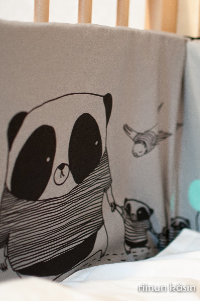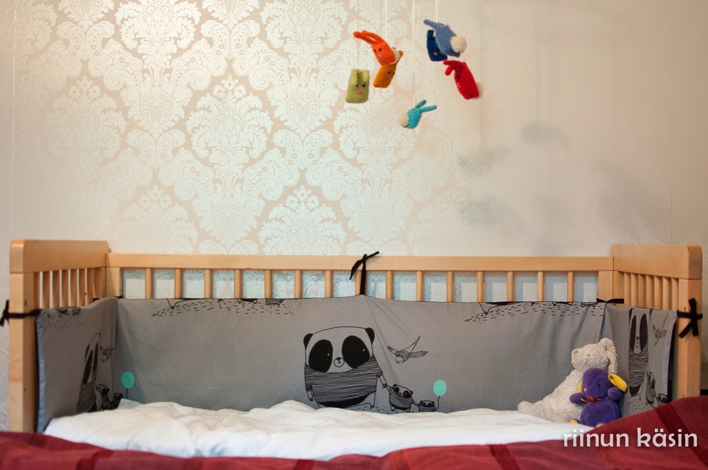 Eilen illalla tein vihdoin reunasuojuksen pinnasänkyyn. Kyllästyin lopullisesti tuttien kaivamiseen sängyn alta keskellä yötä. Niinpä valikoin varastoistani Viljamin pandapuuvillan ja mustan lakanan jämät ja ryhdyin toimeen. Tukena on vanhan reunasuojuksen superlonit, ja suoja on vähän pienempi kuin sängyn mitat, joten se ei jää lörpsöttämään kuten vanha.