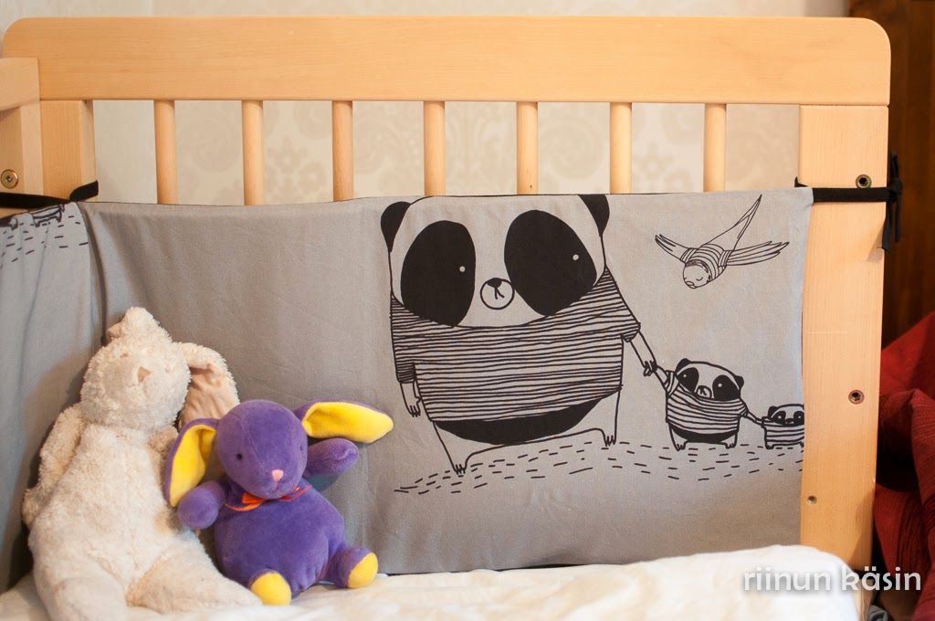 Eilen illalla tein vihdoin reunasuojuksen pinnasänkyyn. Kyllästyin lopullisesti tuttien kaivamiseen sängyn alta keskellä yötä. Niinpä valikoin varastoistani Viljamin pandapuuvillan ja mustan lakanan jämät ja ryhdyin toimeen. Tukena on vanhan reunasuojuksen superlonit, ja suoja on vähän pienempi kuin sängyn mitat, joten se ei jää lörpsöttämään kuten vanha.