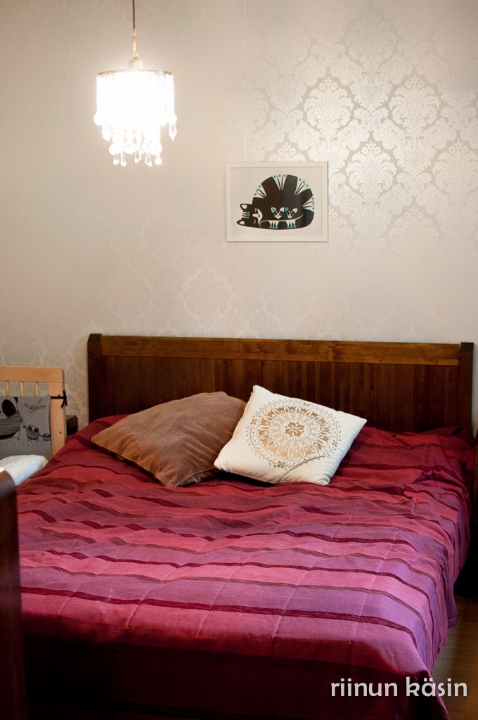 Sängyn yläpuolelta puuttuu vielä pienet lasiset lukuvalot, sillä niiden seinäpidikkeet ovat yhä hukassa muuton jäljiltä. PaaPiin ihana kissataulu kuitenkin pääsi jo seinälle. En voinut vastustaa sitä. Päiväpeitto ei ehkä sovi tuonne parhaalla mahdollisella tavalla, mutta olkoon nyt siellä. Talviverhot ovat kuitenkin viininpunaiset..