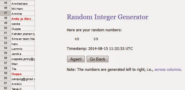 Harmillisesti kävi niin, etten saanut yhteyttä ensimmäisen arvonnan voittajiin parin viikon odottelun ja useamman viestinkään jälkeen. Näinpä päädyin sitten suorittamaan arvonnan uudestaan.