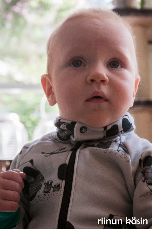 Kaavana on aiemmista jumppiksistani tuttu Indian Elephant, mutta suurensin tämän kokoon 86. Mallin koot loppuivat kokoon 80. Lisäsin malliin (taas) kauluksen. Tällä kertaa vetoketju ei jatku kaulukseen asti – sillä minulla ei ollut riittävän pitkää vetoketjua – vaan kauluksessa on kaksi Käpyseltä ostettua tähtinepparia. Hihan rillipääpandan lasit väritin vihreiksi Ikean kangastussilla 🙂 Tykkään tämän kapeasta mallista, ja se istuu minusta erinomaisesti Einolle. Tämä on vaan niin ihana ❤