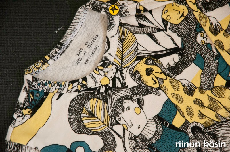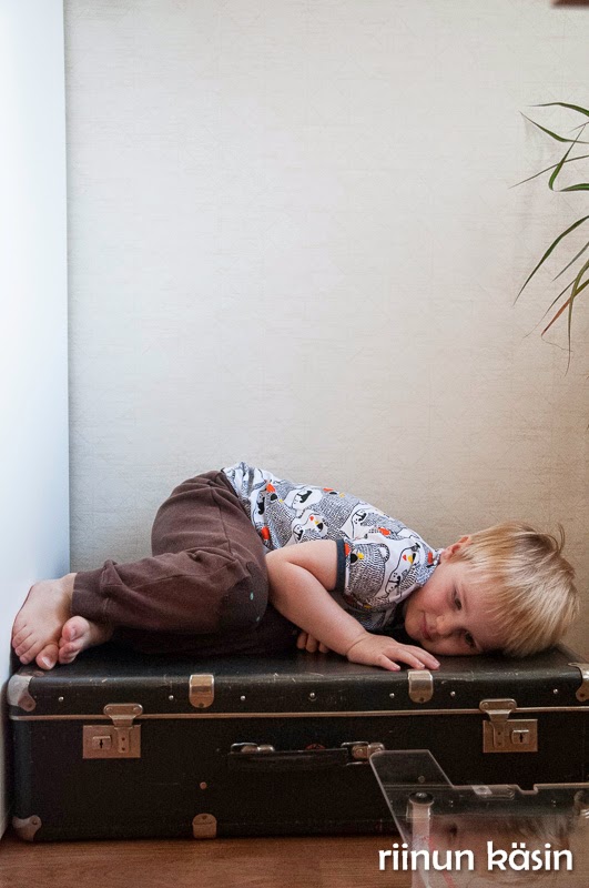Ehdin ostaa oman pienen palan Tuikkeen Hukkaa, ja kyllä se on ihanaa 🙂 Tämä oli taas tuntumaltaan ihan omaa luokkaansa, pehmeää ja joustavaa. Tuo Aarrekidin trikoo oli tämän rinnalla hiekkapaperia, enkä ole ollenkaan varma, haluanko tehdä lopusta yhtään mitään. T-paidan kaavaa en muista, mutta nyt osui sopivan kokoinen slimmi malli koossa 110. Kaava oli pitkähihaiselle paidalle, mutta tein juuri niin pitkät hihat kuin kankaasta riitti. Hukkaa ei jäänyt yhtään yli. Meleerattu sininen ”farkkuresori” on jättirätistä, ja se on erinomaista kanttaukseen!