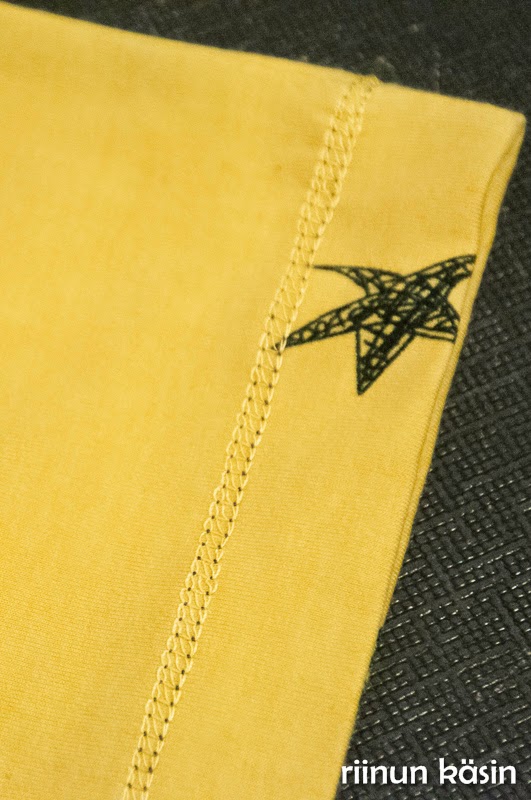 Olin jemmannut tätä(kin) kangasta ties miten pitkään kaapissa. Ostin sen joskus hetken mielijohteesta, enkä sitten kankaan saatuani ollut enää ihan varma, tykkäsinkö siitä vai en. Se hautautuikin sitten kaapin perukoille pitkäksi aikaa. Viime viikolla kävin Name Itin Midseason salessa Vilhon kanssa, ja bongasimme nämä ihkut farkut sieltä alta 12 eurolla! Heti nähtyäni nämä tajusin, että nyt minun on ommeltava paita niistä Riivaleista!