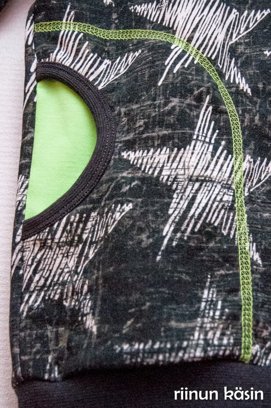 Päätin vielä kerran tehdä itse lahjan kummipojalleni. Tämä taitaakin nyt olla viimeinen kerta. Isoille pojille on vaan todella vaikea tehdä mitään itse – ainakaan sellaista, mikä miellyttäisi myös saajaa. Itse olen tähän varsin tyytyväinen. Saan lopusta kankaasta luultavasti paidan vielä jommallekummalle omista pojistani. Koitin olla tätä leikatessani mahdollisimman taloudellinen, jotta kangas riittäisi vielä 110-kokoiseen paitaan. Tämä on siis kokoa 134-140 ja tehty ekaluokkalaiselle. Malli on Ottobren Green Star -hupparista (4/2014). Tein tähän erilaisen ”hupun” eli korkean kauluksen kiristysnyörillä sekä taskut. Pääntietä avarsin vähän, jotta paita menisi helposti päälle ilman alkuperäisessä mallissa ollutta nappi/neppilistaa. Kangas on Selian tähtijoustocollegea ja neonväristä jerseytä. Resori on Majapuun tummin harmaa. Nyöri ja stoppari ovat Jätti-Rätistä.