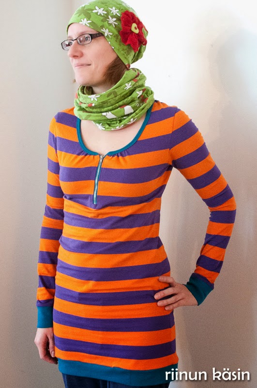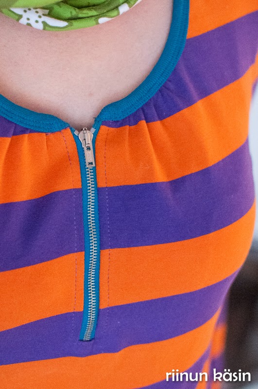 Ehkä tämä paita ei ole maailman edustavin, mutta ainakin se on mukava! Raitapaita syntyi ex tempore Saumanvaran perjantaiveivissä tribuuttina Noshille. Jos minulla olisi sopiva myyntikanava (lue: paljon lapsellisia tuttavia tai työkavereita) ja tarpeeksi rahaa aloituspakettiin, alkaisin kotimyyjäksi. Nyt pitää tyytyä pelkään ostamiseen. Paidan raitakangas ja resori on Noshin, vetoketju omista varastoista. Kaavana tuttu ja turvallinen Stormy Blue Ottobresta. Vetoketju mahdollistaa myös imetyksen. Kuvittelin pärjääväni jo ilman imetyspaitaa, mutta onhan se vaan järkevässä vaatteessa helpompi hoitaa, vaikkei ihan joka tunti enää tarvikaan kaivaa eväitä esille.