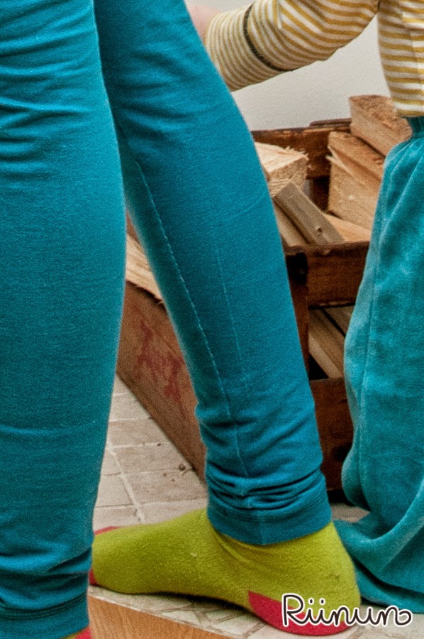 Nämä kuvat on otettu päivän käytön jälkeen. Polviin tuli kauheat pussit, sillä kangas ei palaudu juurikaan. Se ei myöskään jousta juurikaan, joten erehdyin tekemään näistä aivan liian tiukat. Legginsit eivät enää ole järin mukavat päällä ja ne on epämiellyttävä pukea – puhumattakaan siitä, millaisilta ne näyttävät päällä… Lisäksi polviin tuli vaaleat läikät päivän mittaan. Myös takapuoli muuttui valkoiseksi. Mieheni ihmetteli, mitä valkoista mulla on takamuksessa, mutta kangas oli vain käytössä muuttunut vaaleammaksi venyneistä kohdista. Pyllykuvaa en julkista! Summa summarum nämä housut pääsivät nyt pitkiksi kalsareiksi tuulihousujen alle pihatöihin. Jee. Saas nähdä, miten Vilhon housut kestävät käyttöä.