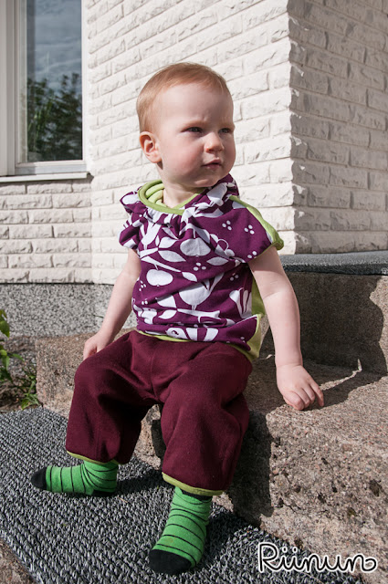 Muistin housujen kaavan olevan ihan kohtuullisen kokoinen, mutta näistä tulikin ihan kauheat lökarit. Onneksi kangaskin on aika kauheaa, joten nämä toimivat varmasti vallan mainiosti hiekkalaatikolla! Hupparin kaava on Ottobren Hello Shark (3/2015). Tämä on minusta tosi kiva ja oikein mainio tällaisena vähän isona (koko 92).