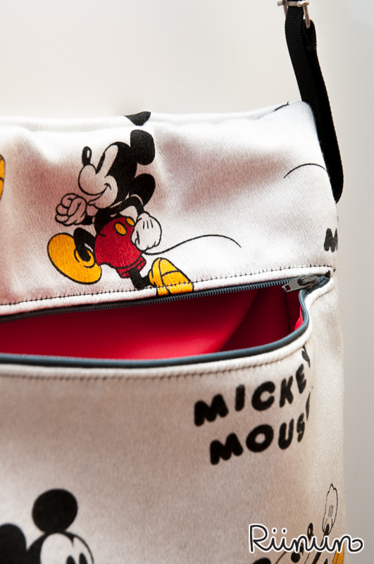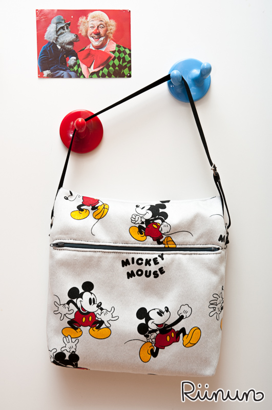 En siis hankkinut Vilhon laukkua varten mitään uutta. Mikki-neuloksen sain joskus siskoltani. Neuloksessa on kaunis satiinisenhohtava pinta, mutta se on kammottavan liestyvää, eikä tämä luultavasti tule kestämään siistinä kovin pitkään. Vuori on samaa kuin Einon ulkoiluhousuissa ja nauha on jostain. Siinä oli toisessa päässä joku muovilenksu ja toisessa päässä tarranauha, joten se on kierrätetty jostain. Keräilen aina tällaisia tarvikkeita, kun niitä osuu eteen. Hihna on lyhyempi kuin vanhassa laukussa, sillä vanhan laukun hihna oli aina solmussa ja lopulta se katkesi.