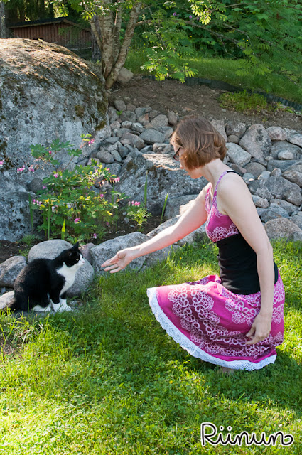 Ostin tämän kankaan Ikasyrilta jo aikoja sitten, mutta en jotenkin osannut tehdä siitä mitään. Osasyynä oli se, että pihiyksissäni tilasin sitä vain 60 senttiä. Eihän se tuntunut riittävän mihinkään. Eilen lapset nukkuivat pitkästä aikaa yhtä aikaa pitkät päiväunet, ja aloin tuijotella kankaitani. Mallasin tätä ensin paidaksi, mutta totesin, etten halua tästä paitaa. Kangas oli jo lähdössä myyntikasaan, kun yhtäkkiä keksin kokeilla sitä hameeksi. 60-senttiä oli juuri sopivasti, kun vyötärön laski lantiolle ja helma oli kääntämättä. Eipä siis kuin ompelemaan.