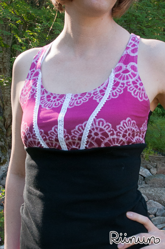 En jaksanut alkaa selata mallilehtiä, enkä viitsinyt ihan vapaalla kädellä saksia tätä, joten kaivoin kaapista kaavakassin, joka sisältää iänkaikkisenvanhat kaavani. Vanhimmat ovat 90-luvulta. Rulla päällä luki ”suora hame”. Otin kaavan, leikkasin sen suikaleiksi ja kellotin helman. Ompelin hameen kasaan ja lisäsin helmaan alkuviikolla Jätti-Rätistä ostamani pitsin. Kankaasta jäi jäljelle muutama pikkupala. Ne suorastaan huusivat pääsyä yläosaksi. Kaapista löytyi kaveriksi kaksi palaa mustaa jerseytä ja paria erilaista pitsiä. Yläosan leikkasin käyttäen mallina ikivanhaa H&M:n toppia. Yläosa on koottu seitsemästä tilkusta ja pitsien alla on kappaleiden saumat.