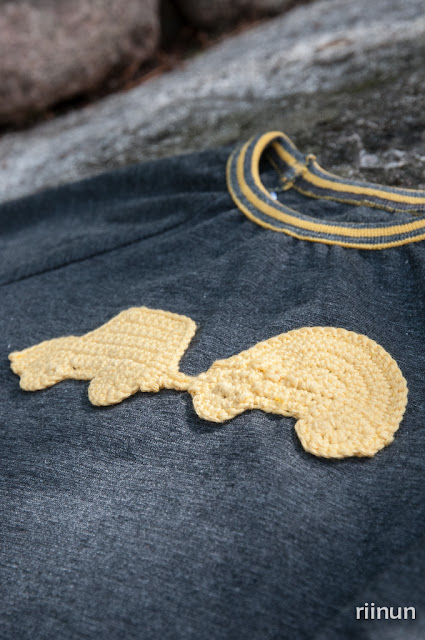 Keltaisiin housuihin löytyi kaapista harmaa-keltaraidallista resoria. Aloin miettiä, ettei Einon garderobista ehkä löydy montaa sopivanväristä paitaa näiden housujen kaveriksi, joten päätin tehdä sellaisen. Kangaskaapissa oli juuri sopivaa harmaata trikoota. Yksivärinen paita yksiväristen housujen kanssa tuntui kuitenkin vähän liian peruspertsalta. Koska sopivaa silityskalvoa ei ollut, enkä jaksanut applikoida paitaan mitään, menin lanka-arkulleni. Sieltä löytyi täydellisesti housujen keltaiseen mätsäävä puuvillalanka, josta virkkasin auton ja peräkärryn pienen autopojan paitaan! Valmiit kuviot ompelin sitten koneella kiinni rinnukseen.