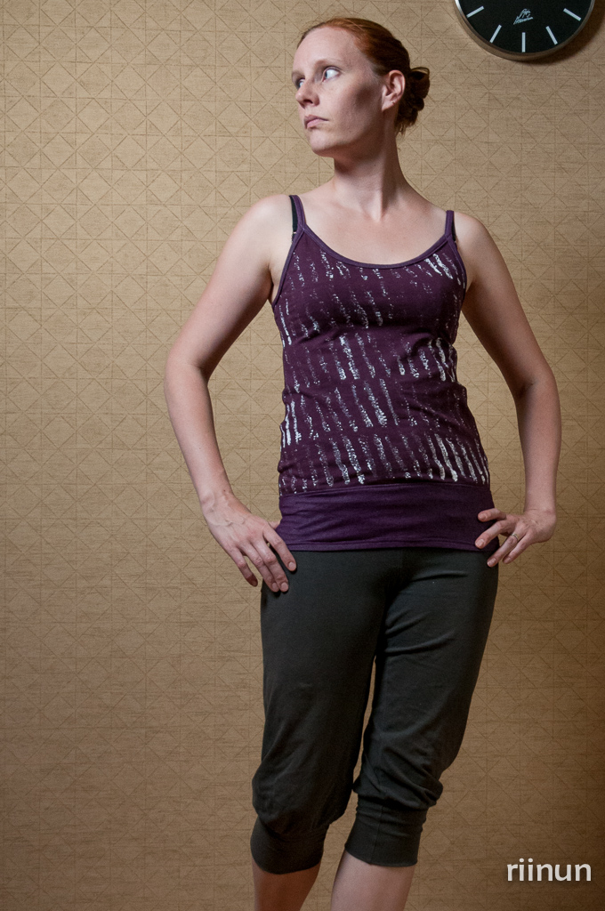 Kankaana on single- ja farkkutrikoota, kuviot olen painanut kankaaseen maissilla. Aika hauska tästä tuli, vaikka tarkoituksena olikin löysä A-mallinen toppi, jollainen tämä – kuten kuvista näkyy – ei todellakaan ole. Käyttöön tämä on kuitenkin päässyt, vaikka kuvia en olekaan saanut aiemmin otettua.