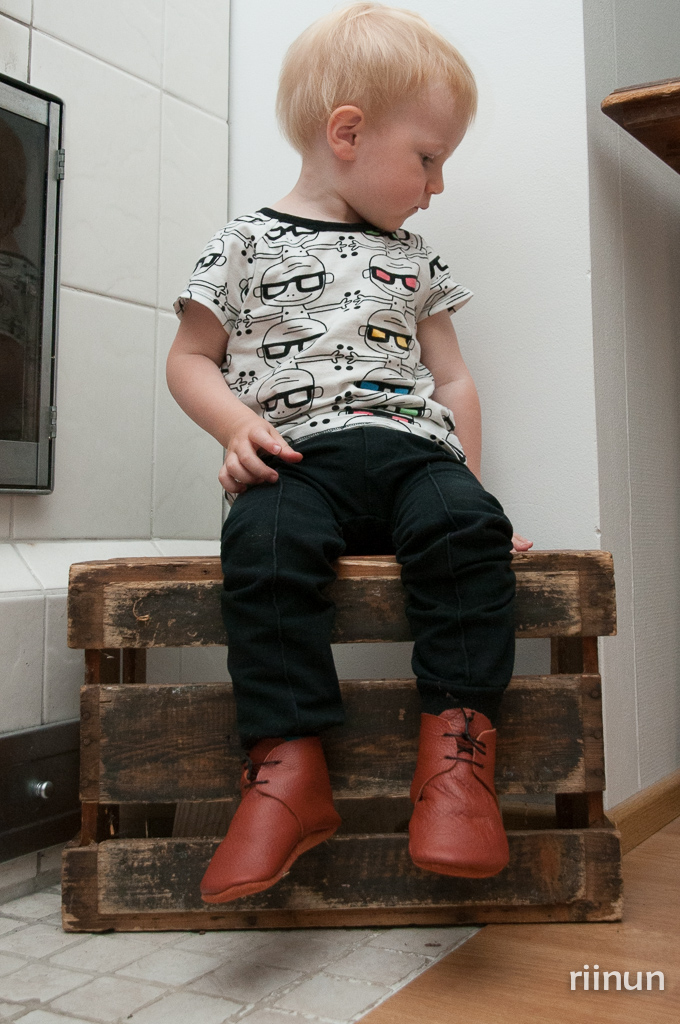 Ihan pientä säätöä kaava kaipaa vielä, mutta aika ihanat näistä tuli! Nahka on paksua mutta pehmeää, aivan ihanteellista tällaisiin! Oikeat kengännauhat olisivat helpommat sitoa, mutta kyllä tämä nyörikin toimii.