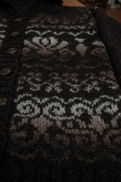 Lanka on yläneläisen Rintalan tilan käsittelemätöntä villalankaa. Langan joukossa on heinänroskia ja pinta on yhä rasvaisen tuntuinen. Olikin hauska neuloa tätä kuivilla käsillä, sillä käsiä ei tarvinnut silloin ollenkaan rasvata. Rasvainen lanka teki kädetkin pehmoisiksi! Eikä tämä edes kutita juuri lainkaan. Tätä voi siis pitää myös lyhythihaisen paidan kanssa. Kuvioita hain Pinterestistä ja sommittelin sitä mukaan kuin työ eteni. Missään vaiheessa minulla ei ollut suunnitelmaa kokonaiskuvasta. Se kostautuikin lopussa, sillä kaulus epäonnistui täysin, ja jouduin tekemään se uusiksi.